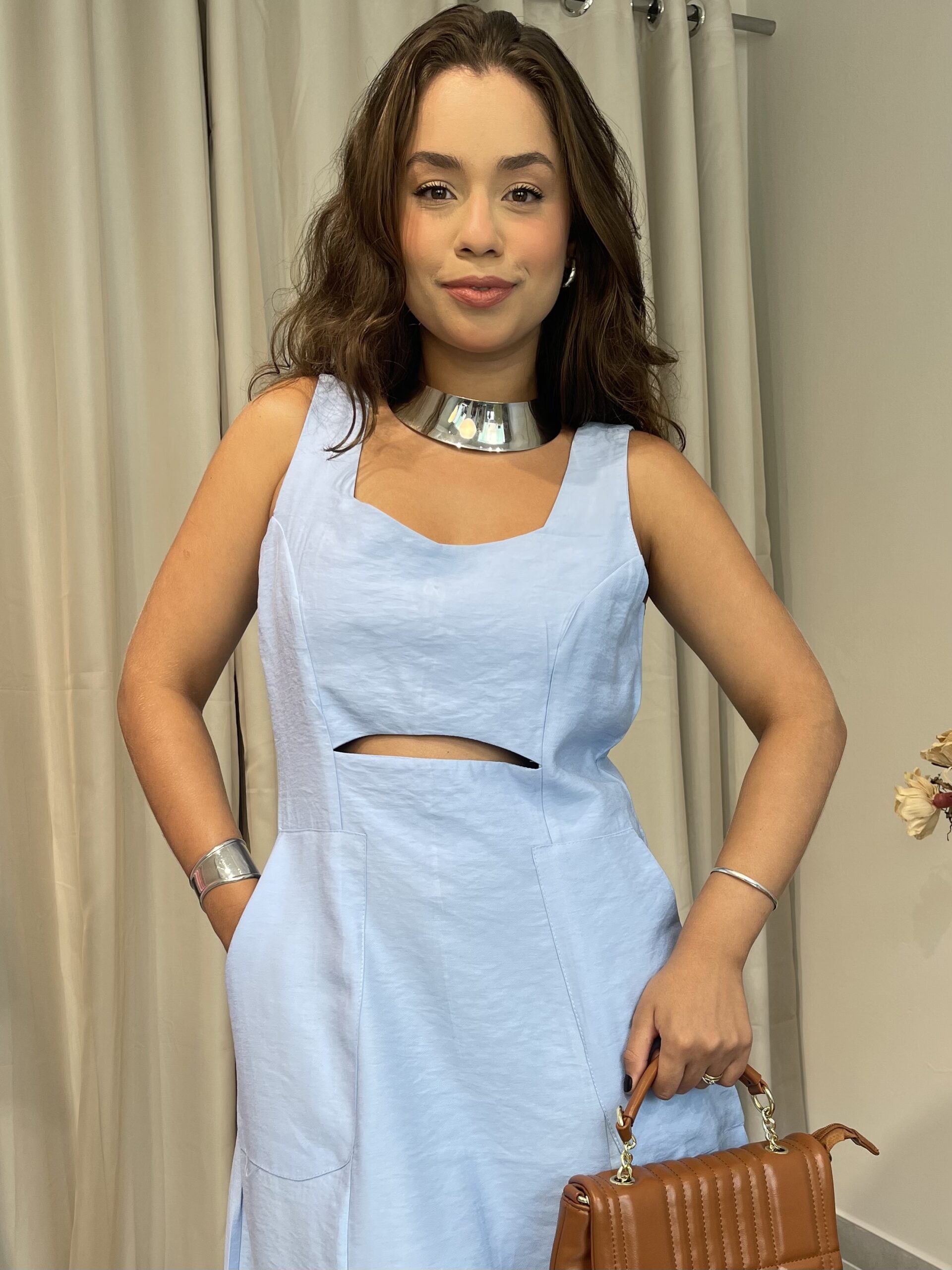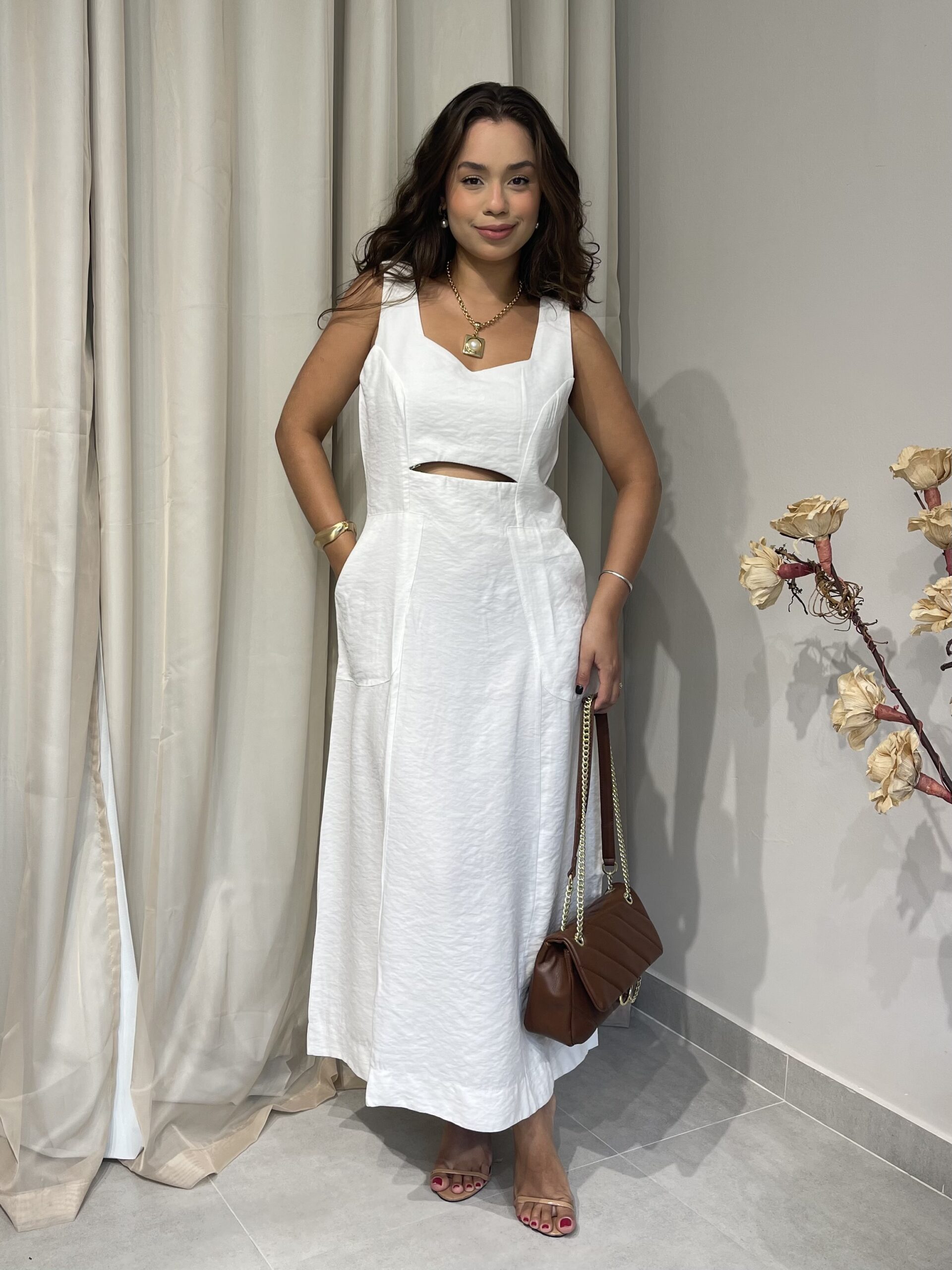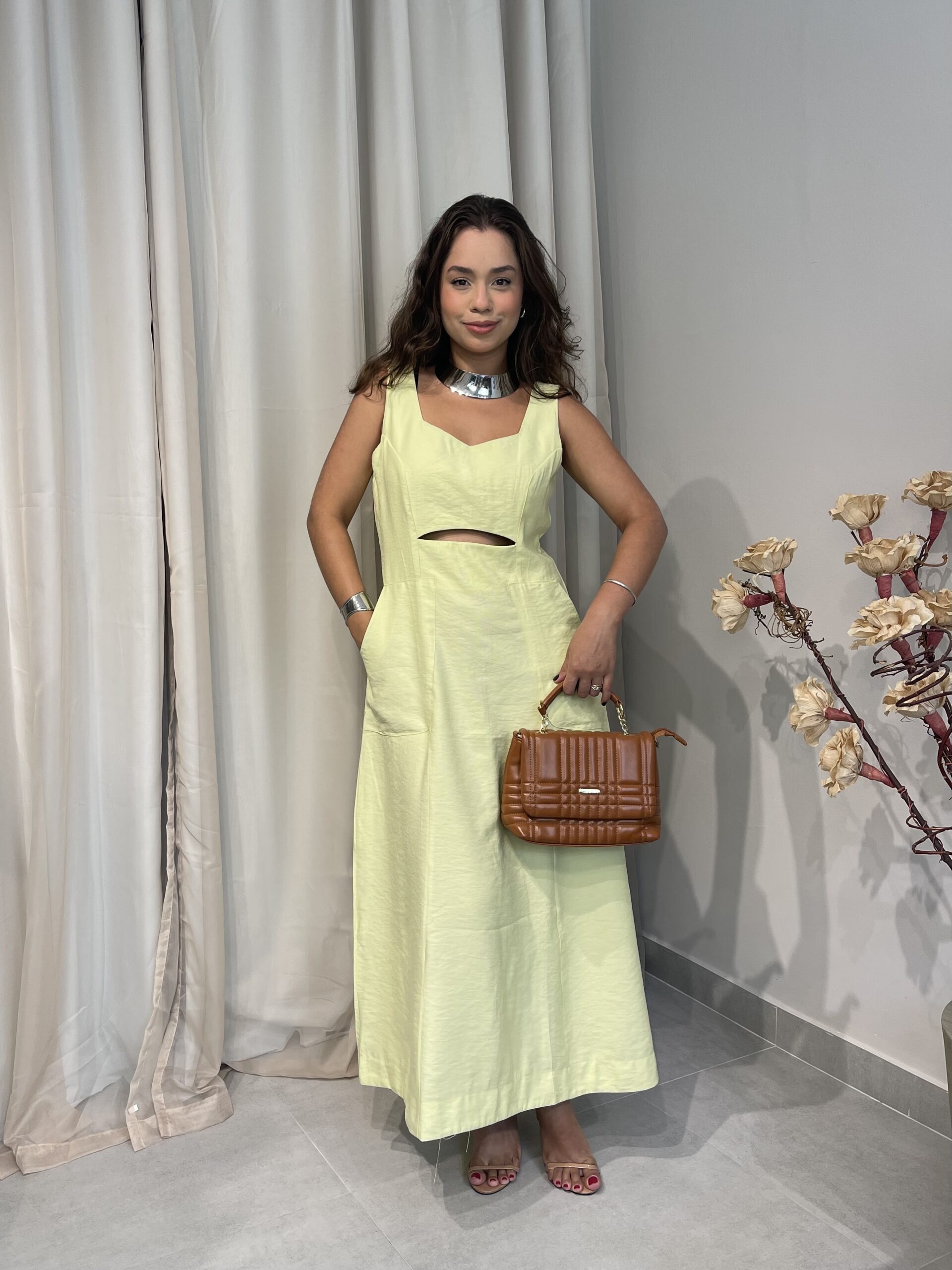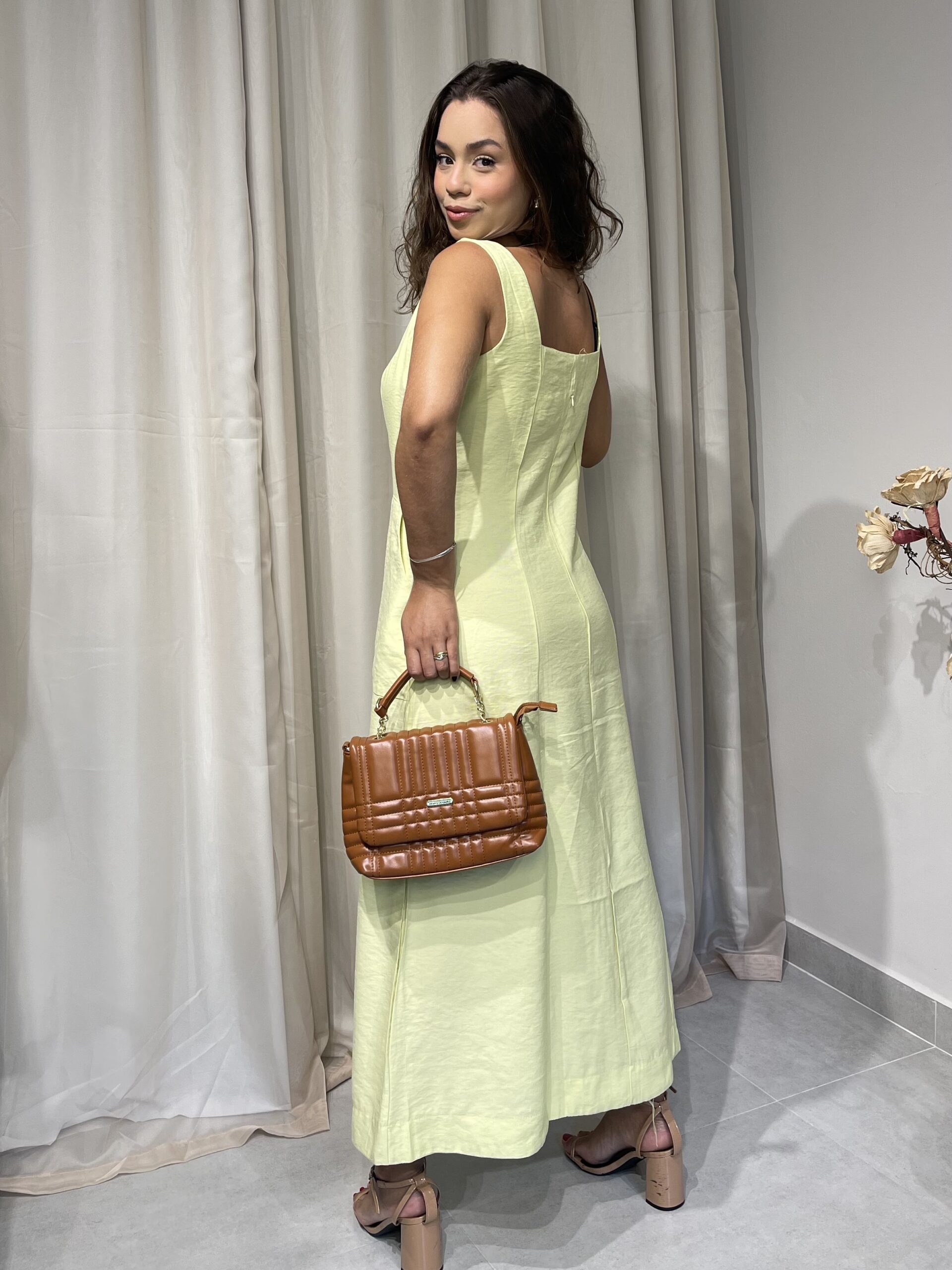 Olívia é um vestido de comprimento longuete confeccionado em tecido marrante. A modelagem é levemente acinturada mas não rente ao corpo. Possui alças largas e um discreto decote V com uma abertura logo abaixo do busto que lhe confere o aspecto de afinamento da silhueta. Possui um zíper invisível nas costas para auxiliar no vestir. A saia é godê mas sutil, com um ótimo caimento.