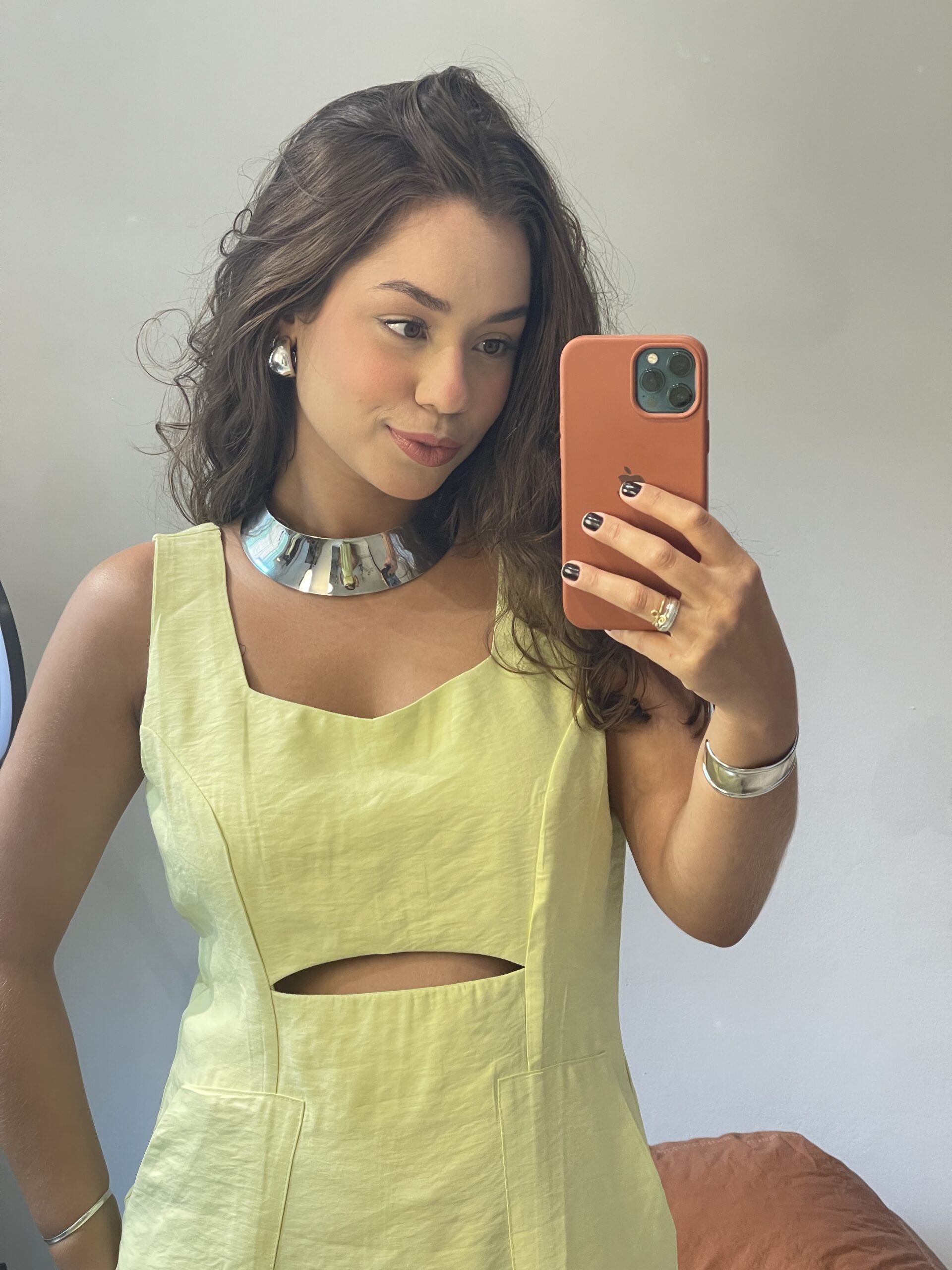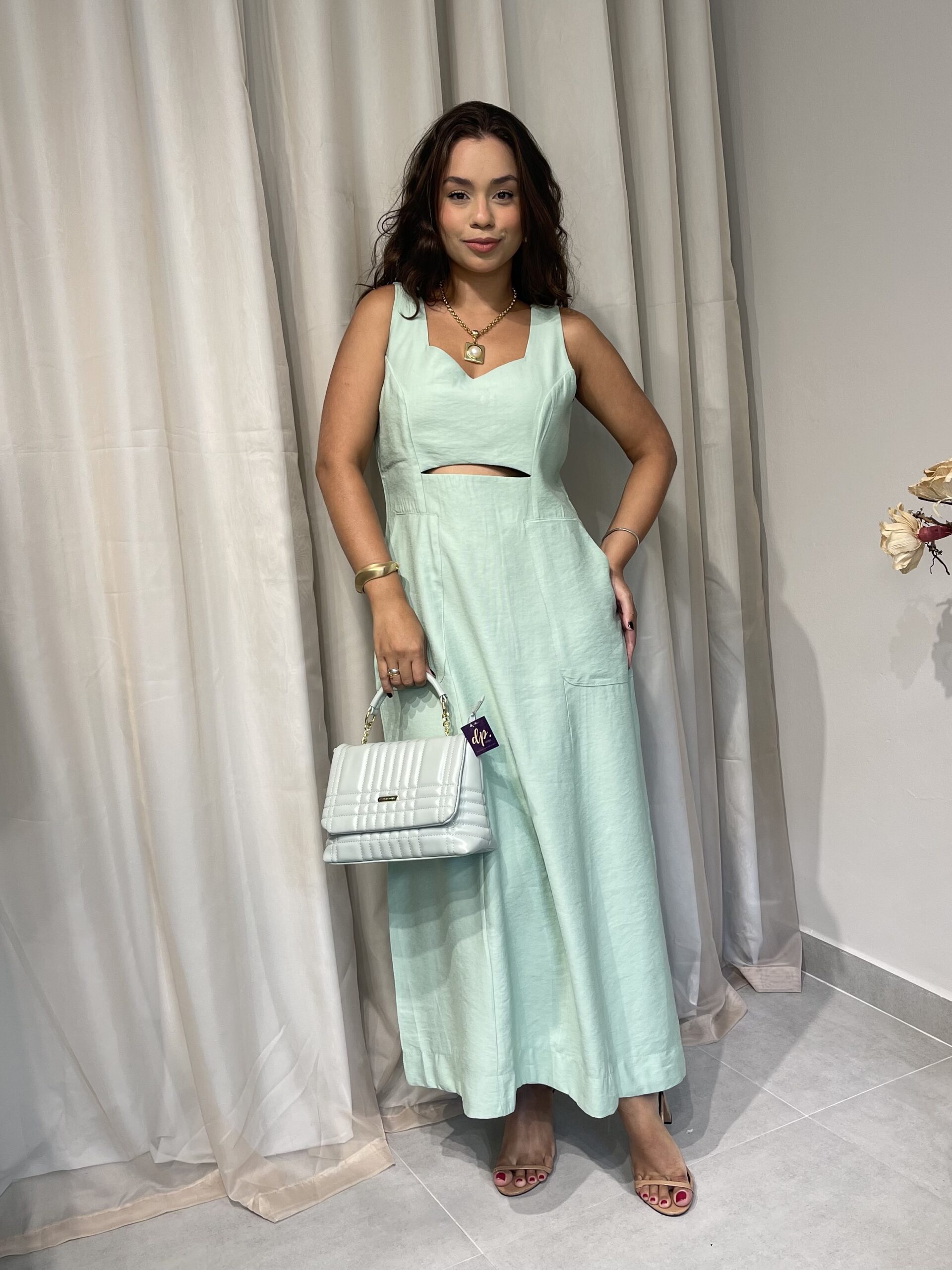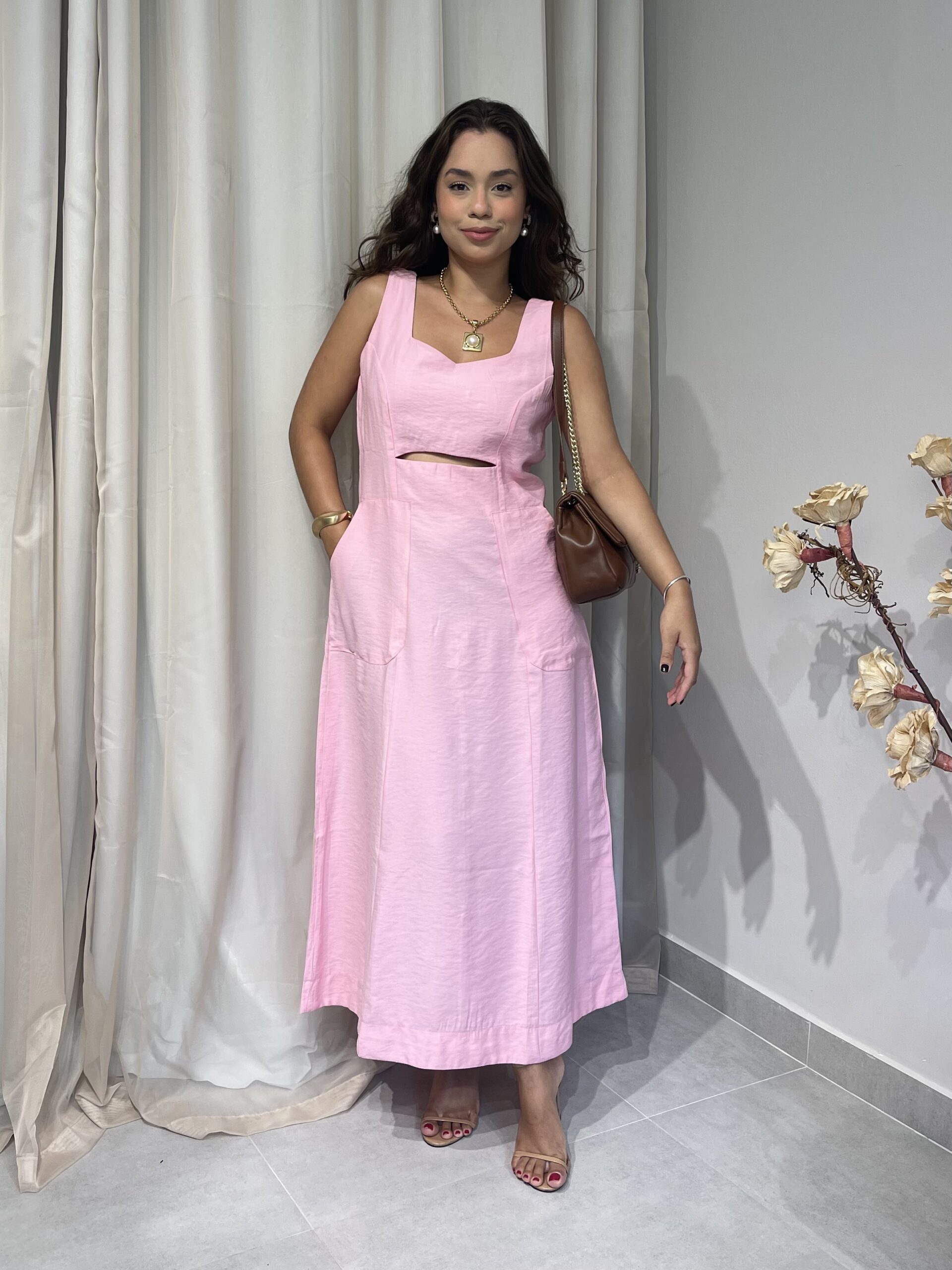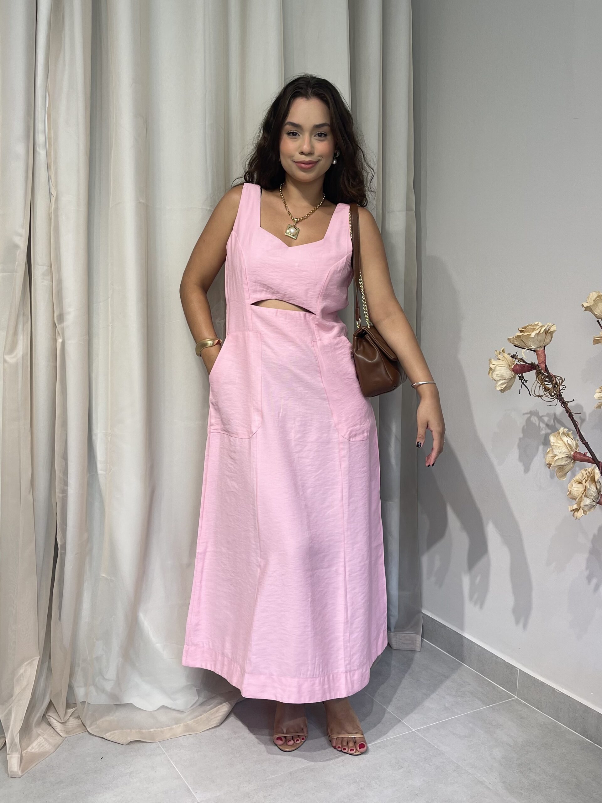 Olívia é um vestido de comprimento longuete confeccionado em tecido marrante. A modelagem é levemente acinturada mas não rente ao corpo. Possui alças largas e um discreto decote V com uma abertura logo abaixo do busto que lhe confere o aspecto de afinamento da silhueta. Possui um zíper invisível nas costas para auxiliar no vestir. A saia é godê mas sutil, com um ótimo caimento.